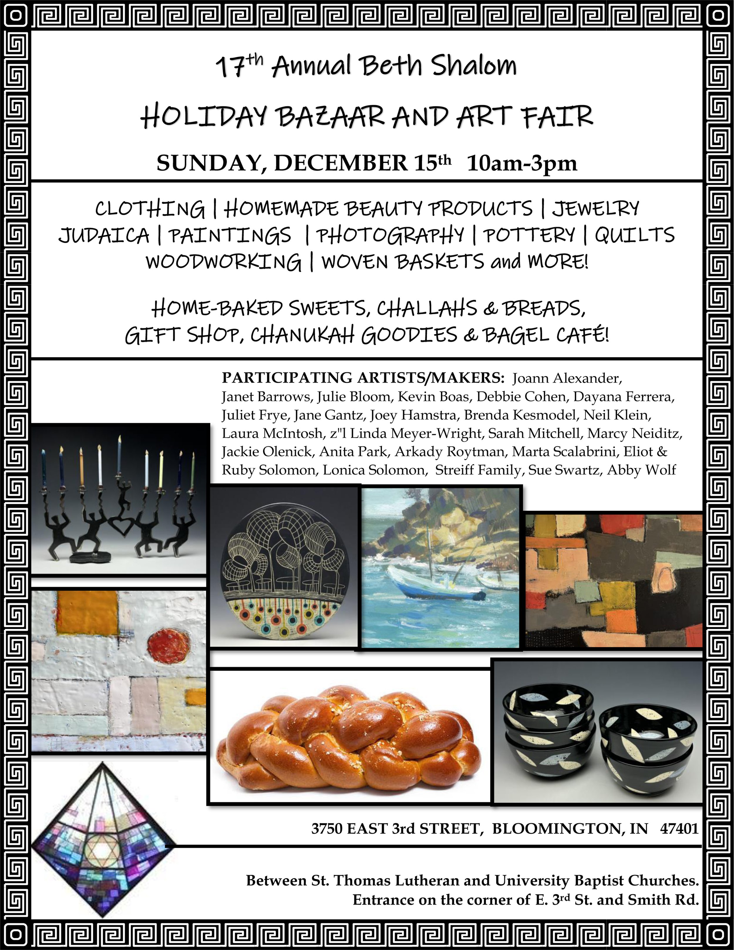 Come to Beth Shalom to shop 24 vendors selling everything from cosmetics, handmade wood items, fabric art, photographs, paintings, ceramics, and more to baked goods, homemade challah, Judaica, and more! Planted Bloomington, a food truck specializing in plant-based and local foods, will be in the parking lot. Open to the public—invite all your friends to support these artists and Beth Shalom!